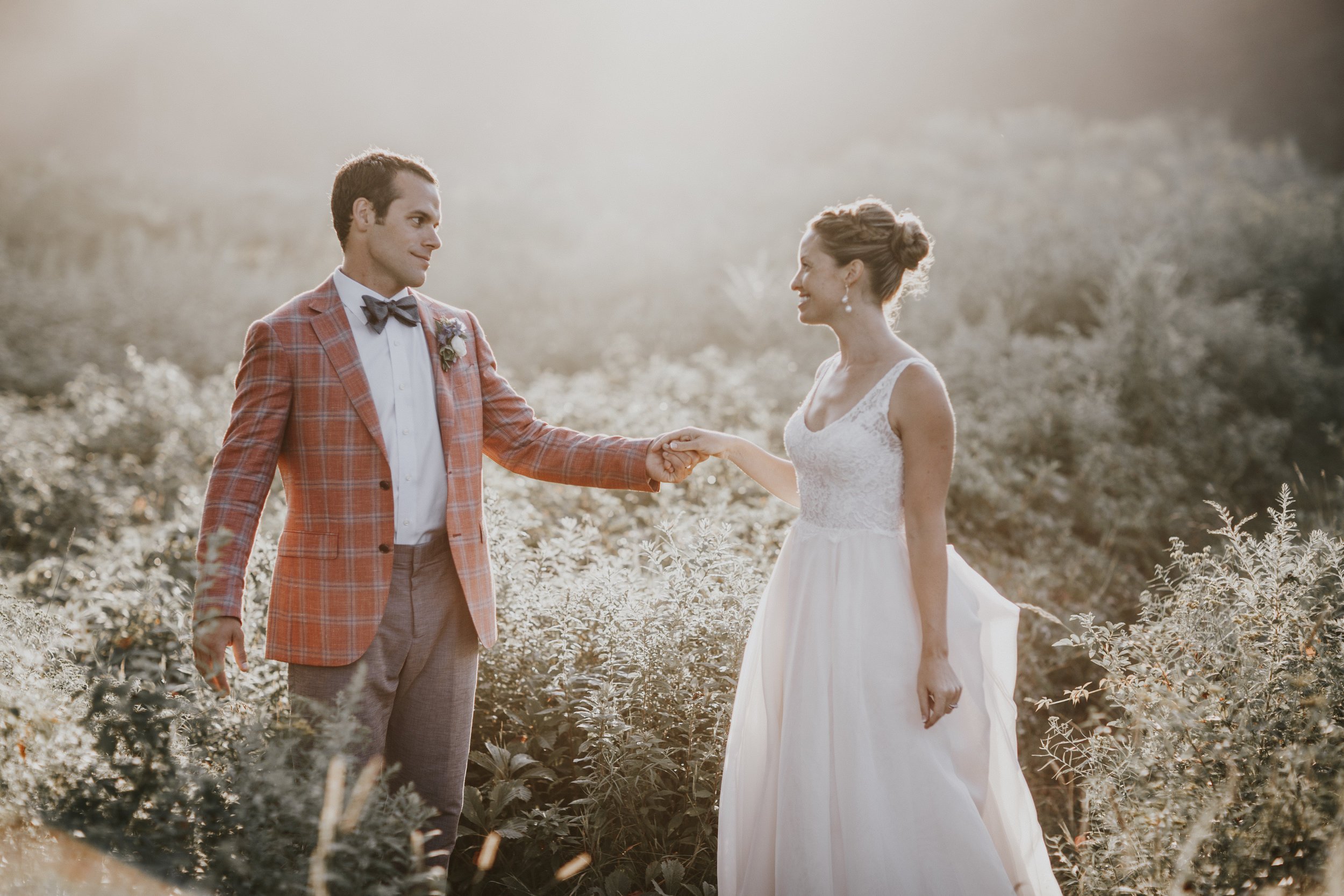 Ashley and Adam were married at The Fells, an estate near Lake Sunapee in New Hampshire. On the drive up from Portland, things did not look good. It was humid and showers threatened. As I arrived at the fells, it began to rain. Hard. The rain let up and Ashley and Adam decided to squeeze in their ceremony before an approaching thunderstorm hit. They timed it perfectly, the rain came down again just as they walked up the aisle as husband and wife. Once the storm passed the sun came out and a golden and shimmering light filtered through the trees.